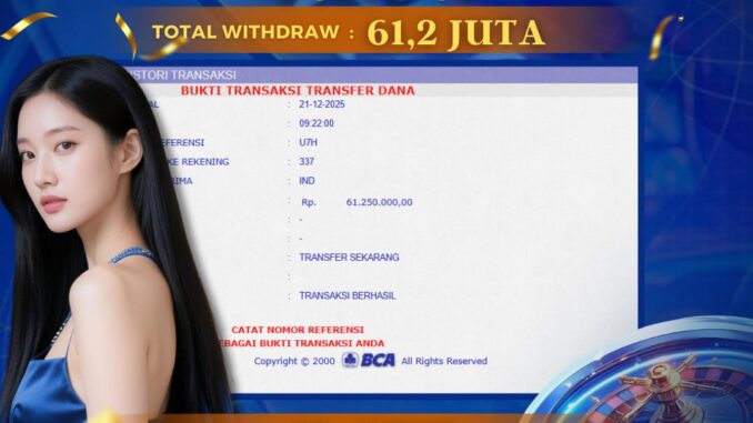 DEWATOGEL mengucapkan selamat kepada user id : IND*** yang telah berhasil mendapatkan jackpot pada permainan LIVE CASINO DI DUEL DICE. Kemenangan sebesar Rp 61.250.000,-. telah dibayarkan LUNAS oleh pihak dewatogel kepada pemilik user id setelah yang bersangkutan mengisi formulir withdraw. Proses pencairan dana berlangsung sangat cepat hanya dalam waktu 5-10 menit sudah berada dalam rekening pemilik user id. Bukti transfer yang dapat anda lihat adalah bukti SAH / VALID yang langsung di dapatkan melalui bukti transaksi dari Bank yang digunakan untuk pengiriman dana pada rekening pemilik user id. Terima kasih kami sampaikan kepada para pengguna setia DEWATOGEL yang telah menggunakan situs kami, sebagai Bandar Terpercaya yang pastinya membayar semua kemenangan member hingga lunas. Apakah DEWATOGEL PENIPU ? Reputasi “DEWATOGEL TERPERCAYA” sudah sangat melekat. puluhan hingga ratusan ribu pengguna setia DEWATOGEL tetap menggunakan situs terbesar dan terbaik di Indonesia ini. Hapus rasa was-was dan khawatir anda, kemenangan anda berapapun PASTI dibayarkan hingga lunas.